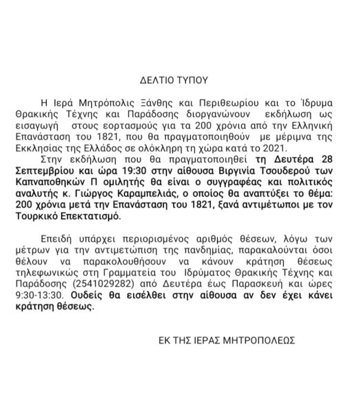Εκδήλωση διοργανώνει η Ιερά Μητρόπολη Ξάνθης και Περιθεωρίου σε συνεργασία με το Ίδρυμα Θρακικής Τέχνης και Παράδοσης ως εισαγωγή στους εορτασμούς για τα 200 χρόνια που συμπληρώνονται το 2021 από την έναρξη της Ελληνικής Επαναστάσεως του 1821. Η εκδήλωση θα έχει ομιλητή τον πολιτικό αναλυτή και συγγραφέα κ. Γεώργιο Καραμπελιά με θέμα “200 χρόνια μετά την Επανάσταση του 1821, ξανά αντιμέτωποι με τον Τουρκικό Επεκτατισμό”