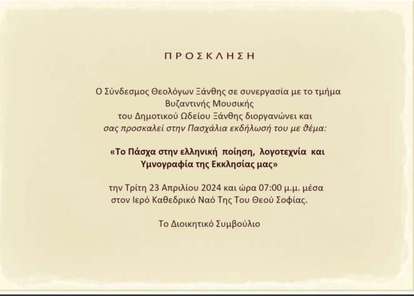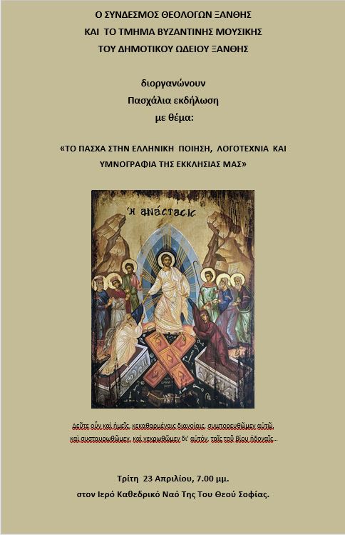 Η Ιερά Μητρόπολη Ξάνθης και Περιθεωρίου γνωστοποιεί προς το χριστεπώνυμο πλήρωμα ότι ο Σύνδεσμος Θεολόγων Ξάνθης θα πραγματοποιήσει πασχάλια εκδήλωση με θέμα: «Το Πάσχα στην ελληνική ποίηση, λογοτεχνία και Υμνογραφία της Εκκλησίας μας», την Τρίτη 23 Απριλίου 2024 και ώρα 19:00, εντός του Ιερού Καθεδρικού Ναού της του Θεού Σοφίας Ξάνθης.