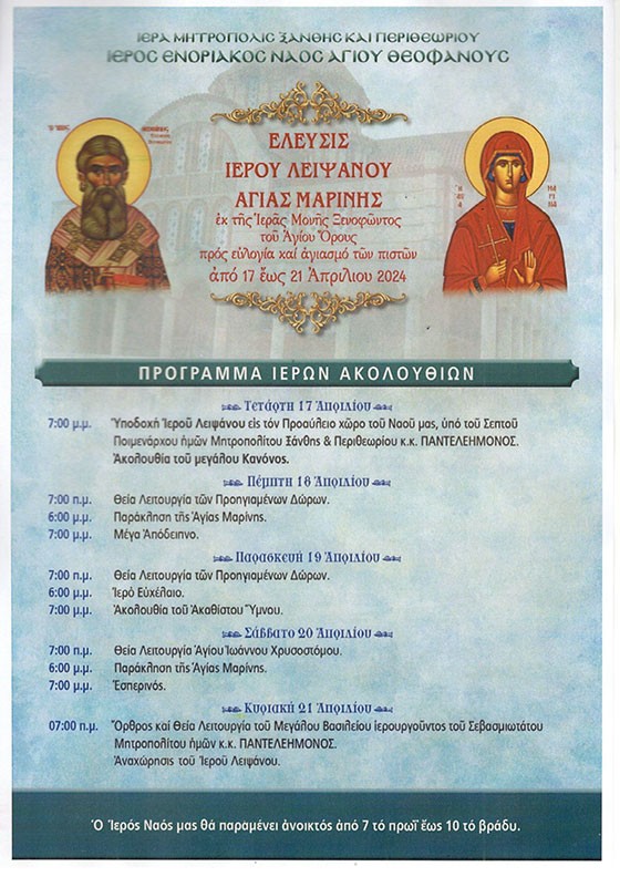Ο Σεβασμιώτατος Μητροπολίτης Ξάνθης και Περιθεωρίου κ. Παντελεήμων θα υποδεχθεί την Τετάρτη 17 Απριλίου στις 19:00, στον προαύλιο χώρο του Ιερού Ενοριακού Ναού Αγίου Θεοφάνους, το ιερό Λείψανο Αγίας Μαρίνης από την Ιερά Μονή Ξενοφώντος του Αγίου όρους.