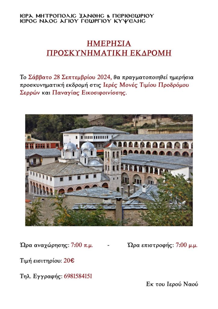 Ημερίσια Προσκυνηματική εκδρομή στις Ιερές Μονές Τιμίου Προδρόμου Σερρών και Παναγίας Εικοσιφοινίσσης θα πραγματοποιηθεί το Σάββατο 28 Σεπτεμβρίου, σύμφωνα με ανακοίνωση του Ιερού Ναού Αγίου Γεωργίου Κυψέλης.