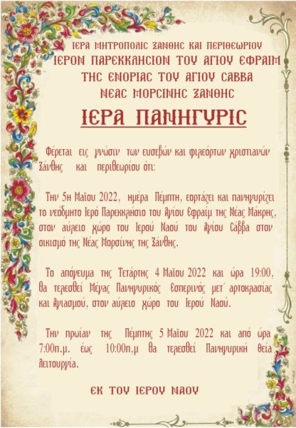 Τον αγιασμό των Θυρανοιξίων στο Ιερό Παρεκκλήσιο του Αγίου Εφραίμ Νέας Μάκρης της ενορίας Αγίου Σάββα Νέας Μορσίνης, θα τελέσει σήμερα, Τετάρτη 4 Μαΐου 2022, και ώρα 18:30 ο Σεβασμιώτατος Μητροπολίτης Ξάνθης και Περιθεωρίου κ. Παντελεήμων. Από σήμερα, λοιπόν, αρχίζει η πανήγυρη που θα ολοκληρωθεί αύριο.