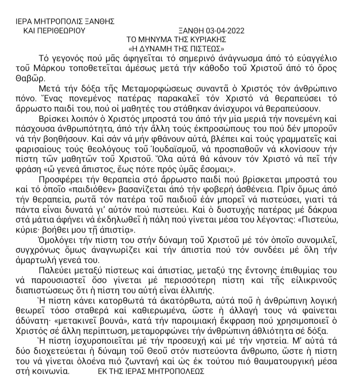 “Η πίστη κάνει κατορθωτά τα ακατόρθωτα, αυτά που η ανθρώπινη λογική θεωρεί τόσο σταθερά και καθιερωμένα, ώστε η αλλαγή τους να φαίνεται αδύνατη. «Μετακινεί βουνά» , κατά την παροιμιακή έκφραση που χρησιμοποιεί ο Χριστός σε άλλη περίπτωση, μεταμορφώνει την ανθρώπινη αθλιότητα σε δόξα”, αναφέρει , μεταξύ άλλων ο Μητροπολίτης Ξάνθης και Περιθεωρίου κ. Παντελεήμων στο μήνυμά του για την Κυριακή 3 Απριλίου.