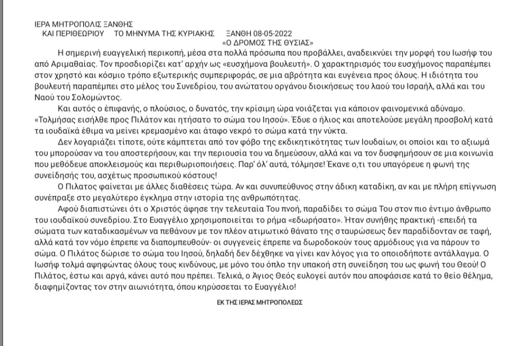 “Η σημερινή ευαγγελική περικοπή, μέσα στα πολλά πρόσωπα που προβάλλει, αναδεικνύει την μορφή του Ιωσήφ από Αριμαθαίας. Τον προσδιοιρίζει κατ’ αρχήν ως «ευσχήμονα βουλευτή». Ο χαρακτησισμός του ευσχήμονος παραπέμπει στον Χριστό και κόσμιο τρόπο εξωτερικής συμπεριφοράς, σε μια αβρότητα και ευγένεια προς όλους. Η ιδιότητα του βουλευτή παραπέμπει στο μέλος του Συνεδρίου, του ανώτατου οργάνου διοικήσεως του λαού του Ισραήλ, αλλά και του ναού του Σολομώντος”, αναφέρει μεταξύ αλλων ο Σεβασμιώτατος.