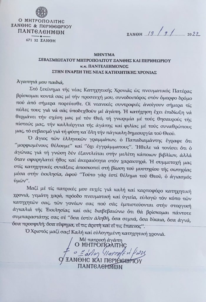 «Στο ξεκίνημα της νέας Κατηχητικής χρονιάς ως πνευματικός Πατέρας βρίσκομαι κοντά σας με την προσευχή μου, συνοδοιπόρος στον όμορφο δρόμο που από σήμερα πορεύεσθε. Οι νεανικές συντροφιές ανοίγουν σήμερα τις πύλες τους για να σας υποδεχθούν με αγάπη. Η κατήχηση έχει επιδιώξει να θερμάνει την σχέση μας με τον Θεό, τη γνωριμία με τους θησαυρούς της πίστεώς μας, την καλλιέργεια της αγάπης και φιλίας με τους συνανθρώπους μας, το σεβασμό για τη φύση και όλη την πάγκαλη δημιουργία του Θεού», αναφέρει μεταξύ άλλων.