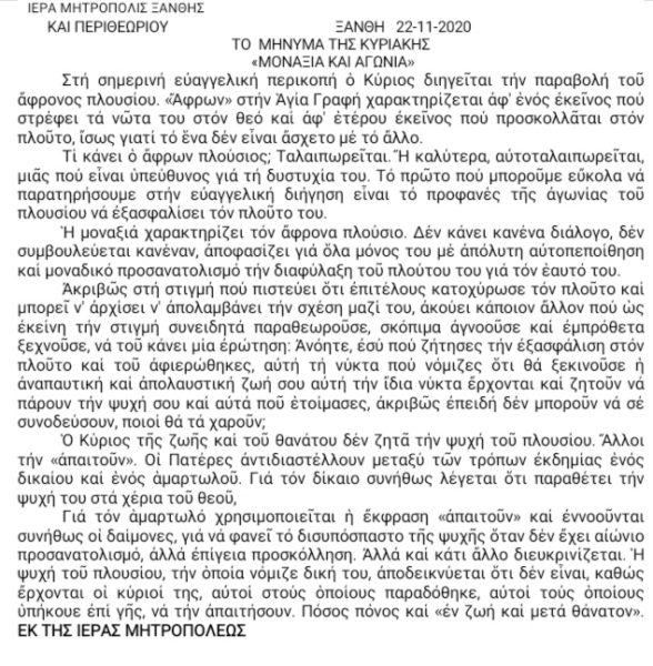 Με αφορμή την παραβολή του άφρονος πλουσίου, που ακούστηκε σήμερα, Κυριακή Θ΄ Λουκά, στην εκκλησία μας, το μήνυμα της Ιεράς Μητροπόλεως Ξάνθης επικεντρώνεται στην αντιδιαστολή μεταξύ των τρόπων εκδημίας ενός δίκαιου ανθρώπου κι ενός αμαρτωλού. Επιπλέον, επεξηγεί τα χαρακτηριστικά της ζωής του πλουσίου, που, όπως λέει, αυτοταλαιπωρείται.