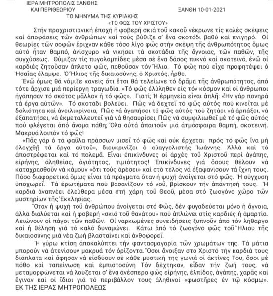 Επισυνάπτεται ΤΟ ΜΗΝΥΜΑ ΤΗΣ ΚΥΡΙΑΚΗΣ – “ΤΟ ΦΩΣ ΤΟΥ ΧΡΙΣΤΟΥ” – της 10ης Ιανουαρίου εκ μέρους της Ιεράς Μητροπόλεως Ξάνθης και Περιθεωρίου.