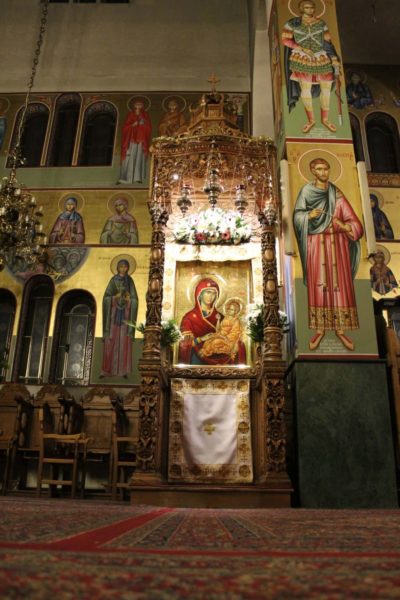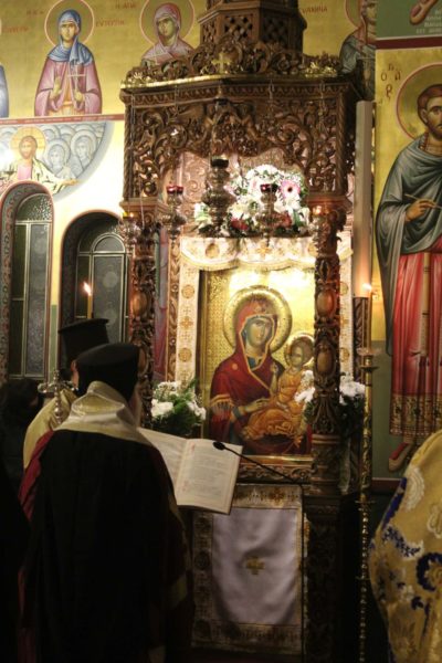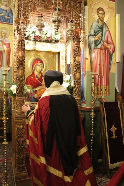 Ο Σεβασμιωτατος αφού έψαλλε τους Χαιρετισμούς ενώπιον της εικόνας της Παναγίας μίλησε θεολογικά και έκανε μια αναφορά στο πρόσωπο της Κυρίας Θεοτόκου .