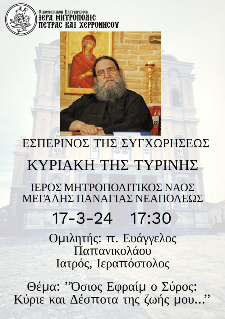 Θα παραστεί και θα μιλήσει ο Αιδεσιμολ. Πρωτοπρεσβύτερος Ευάγγελος Παπανικολάου, κληρικός της Ιεράς Μητροπόλεως Καμερούν, ιατρός και ιεραπόστολος, με θέμα: «Όσιος Εφραίμ ο Σύρος: Κύριε και Δέσποτα της ζωή μου…».