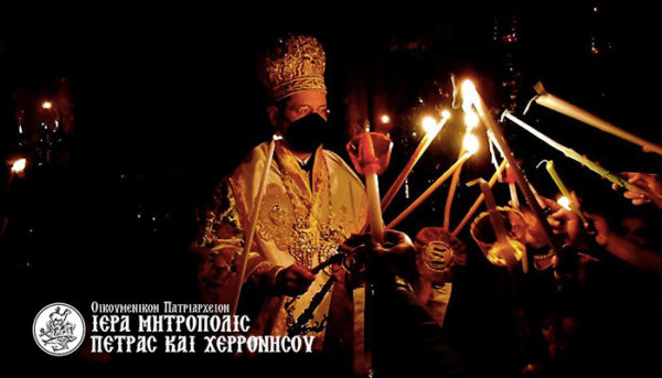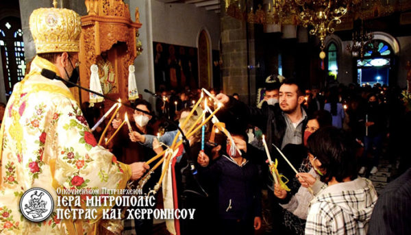 Ο Σεβασμιώτατος μετέδωσε στους πιστούς το Άγιον Φως, το προερχόμενο από τον όλβιο Τάφο του Κυρίου μας στα Ιεροσόλυμα, ψάλλοντας το «Δεύτε λάβετε Φως…».