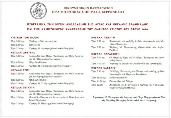 Η Ιερά Μητρόπολη Πέτρας και Χερρονήσου ανακοίνωσε το πρόγραμμα των Ιερών Ακολουθιών της Αγίας και Μεγάλης Εβδομάδος και της Αναστάσεως για το 2020. Μπορείτε να δείτε αναλυτικά τις ώρες στο πρόγραμμα παρακάτω: