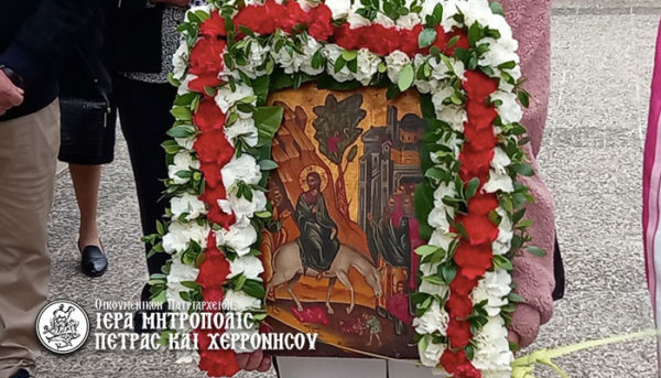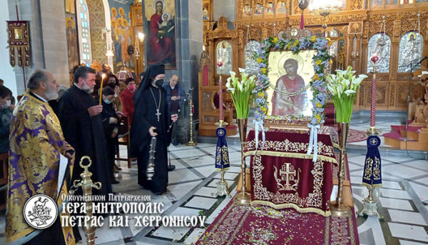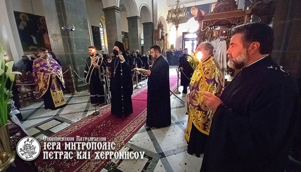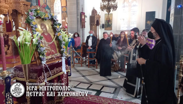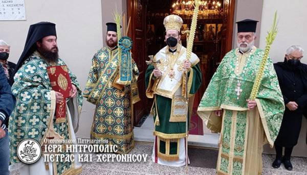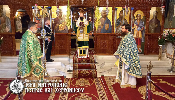 Ο Σεβασμιώτατος, ανταποκρινόμενος για ακόμη μία φορά με πολλή αγάπη και χαρά στην πρόσκληση του Σεβασμ. Μητροπολίτου Πέτρας και Χερρονήσου κ. Γερασίμου να χοροστατήσει των Ιερών Ακολουθιών της Αγίας και Μεγάλης Εβδομάδος καθ’ όσο διάστημα ευρίσκεται στο Φανάρι ως μέλος της Ιεράς Συνόδου του Οικουμενικού Πατριαρχείου, ευλόγησε τα Βάϊα και προέστη στην λιτάνευσή των πέριξ του Ιερού Ναού προ της ενάρξεως της Θείας Λειτουργίας, κατά την δέουσα εκκλησιαστική τάξη.