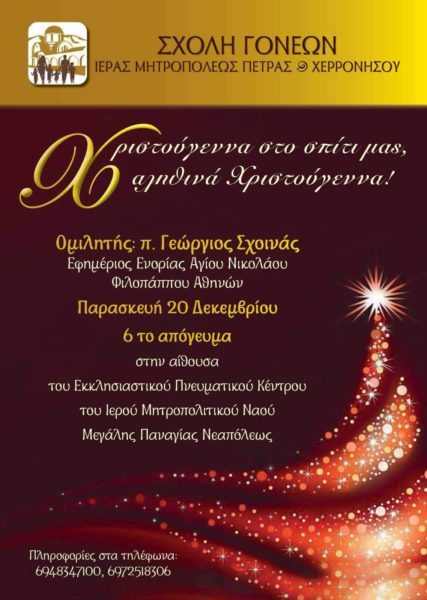 Στο πλαίσιο των Δραστηριοτήτων της Σχολής Γονέων της Ιεράς Μητροπόλεως Πέτρας και Χερρονήσου, θα παραγματοποιηθεί ομιλία του π. Γεωργίου Σχοινά την Παρασκευή 20 Δεκεμβρίου, στις 6.00 μμ, στο Εκκλησιαστικό Πνευματικό Κέντρο του Ιερού Μητροπολιτικού Ναού Μεγάλης Παναγίας Νεαπόλεως, με θέμα, “Χριστούγεννα στο σπίτι, αληθινά Χριστούγεννα”.