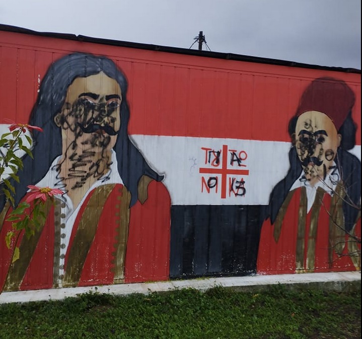 Οι βάνδαλοι δεν δίστασαν να γράψουν στις μοναδικής αισθητικής ξυλόγλυπτες πόρτες του Ιερού Ναού του Ευαγγελισμού της Θεοτόκου και στους πέτρινους τοίχους της οπαδικά σύμβολα και συνθήματα.