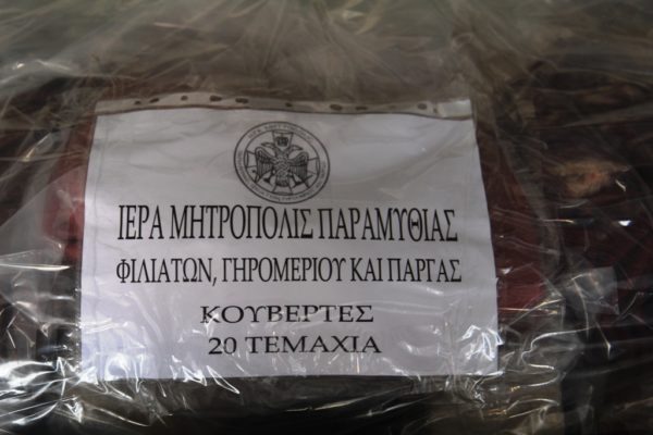 Η Ιερά Μητρόπολη Παραμυθίας, Φιλιατών, Γηρομερίου και Πάργας ανταποκρινόμενη άμεσα στην απόφαση της Ιεράς Συνόδου της Εκκλησίας της Ελλάδος για στήριξη των πληγέντων στην Τουρκία και στη Συρία από τον φονικό σεισμό της 6ης Φεβρουαρίου, συγκέντρωσε περίπου 7 τόνους ανθρωπιστικό υλικό από τα ακόλουθα είδη: καινούργια κλινοσκεπάσματα, εμφιαλωμένο νερό, γάλα μακράς διαρκείας, ζυμαρικά, ρύζι και όσπρια.