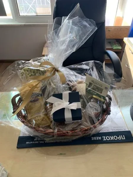 Ο Σεβασμιώτατος ευχαριστώντας πρόσφερε ένα καλάθι με προϊόντα.