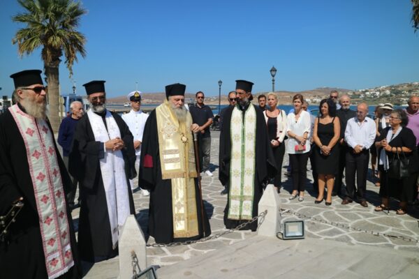 Στο τέλος της Θείας Λειτουργίας τέλεσε το Μνημόσυνο των 82 συνανθρώπων μας που έχασαν την ζωή τους στην ναυτική τραγωδία του Express Samina (26-9-2000) και ευχήθηκε ο Κύριος μας να τους αναπαύει “εν σκηναίς δικαίων και αγίων“, να χαρίζει δε στους πονεμένους συγγενείς και οικείους τους την εξ Ύψους παρηγορίαν. Στην συνέχεια μετέβη στο Ακρωτήριο ‘’Κορακιές’’ όπου στο Ιερό Παρεκκλήσιο του Αγίου Ιωάννου του Θεολόγου τέλεσε Επιμνημόσυνη Δέηση. Συμμετείχαν η Βουλευτής Κυκλάδων κα Αικατερίνη Μονογυιού, ο Δήμαρχος, ο Έπαρχος και ο Λιμενάρχης Πάρου, οι τοπικοί φορείς, οι συγγενείς των θυμάτων και πολλοί Πάριοι. Τέλος μετέβη στο σημείο που βρίσκεται ο ανδριάντας του τότε Λιμενάρχη Πάρου Δημητρίου Μάλαμα (εκ Νάξου), ο οποίος άφησε την τελευταία του πνοή την φοβερή εκείνη νύχτα του ναυαγίου προσφέροντας θυσιαστικά τις υπηρεσίες του και τέλεσε Τρισάγιο.