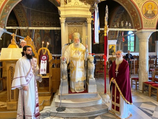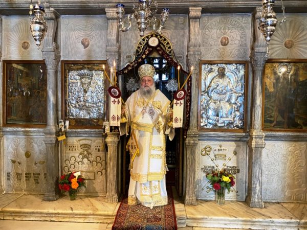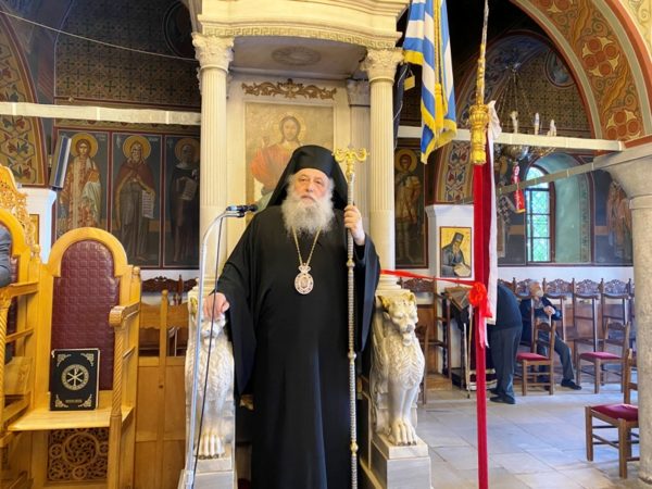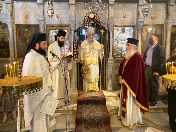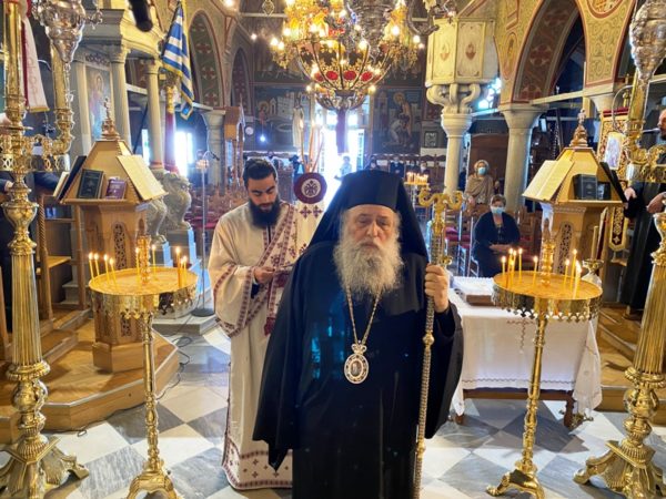 Ο Σεβασμιώτατος χοροστάτησε στον Όρθρο, ιερούργησε και κήρυξε τον θείο λόγο, συλλειτουργούντων του Πρωτοσυγκελλεύοντος της Ιεράς Μητροπόλεως Αρχιμ. Δωροθέου Βενετσανοπούλου, του Εφημερίου του Ιερού Ναού και Γενικού Αρχιερατικού Επόπτου Νάξου Πρωτοπρ. Ιωάννου Μανιού και του Διακόνου Νεκταρίου Σκουλάτου. Προ της Απολύσεως προέστη του Μνημοσύνου του αειμνήστου Θεμιστοκλέους (Θέμου) Λιανοπούλου.