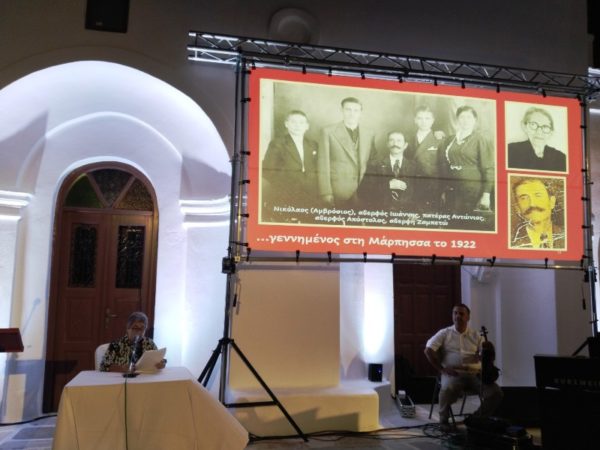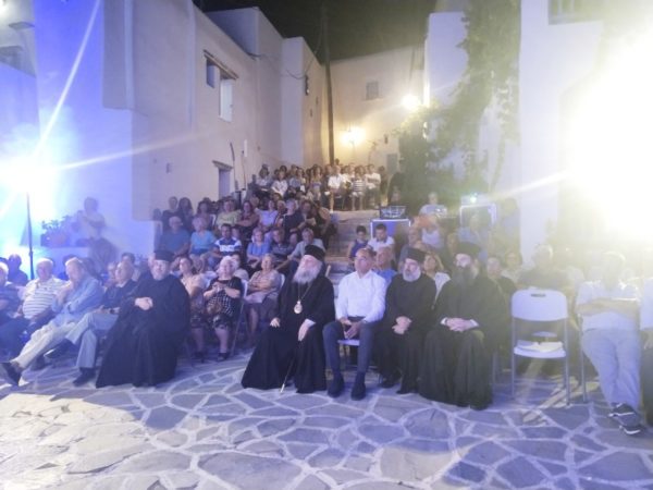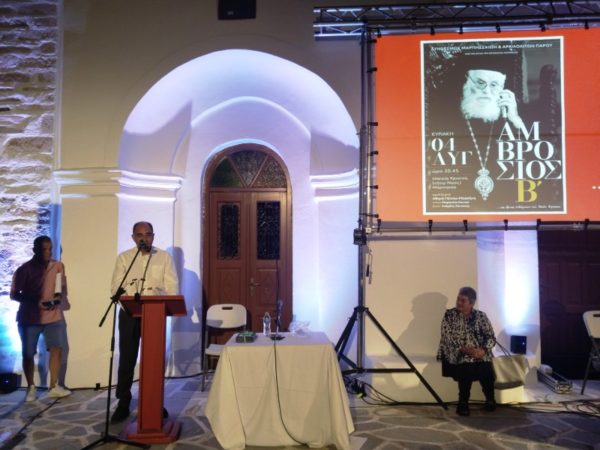 Ακολούθως μετέβη στην πλατεία Χριστού Ναού της Μεταμορφώσεως του Σωτήρος, όπου παρηκολούθησε την εκδήλωση, την οποία διοργάνωσε ο Σύλλογος Μαρπησσαίων & Αρχιλοχιτών Πάρου προς τιμήν του μακαριστού Μητροπολίτου Παροναξίας Αμβροσίου Β’ του Παρίου. Η εκδήλωση περιλάμβανε προβολή με την ζωή και την διακονία του τιμωμένου Ιεράρχου, μουσικά ακούσματα, ενώ για την προσωπικότητά του αοιδίμου ομίλησε η κ. Αθηνά Πέππα-Μεσσήνη.