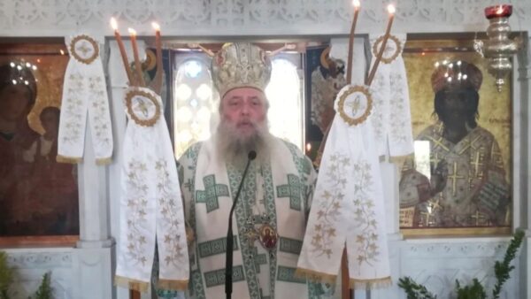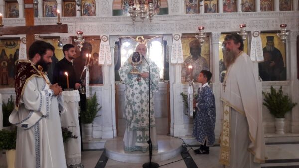 Στο τέλος της Θείας Λειτουργίας, ο Σεβασμιώτατος απηύθυνε ευχές προς τον εορτάζοντα Διάκονο του Ναού π. Ευστάθιο Βασιλάκη.