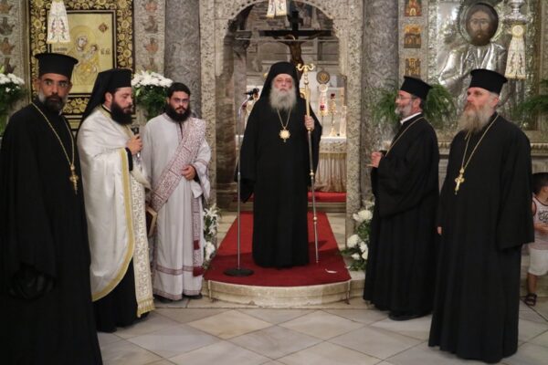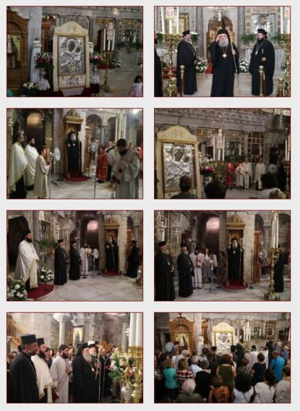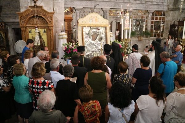 Ευθύς αμέσως, μετέβη στο Ιερόν Προσκύνημα Παναγίας Εκατονταπυλιανής, στο οποίο φυλάσσεται η ομώνυμη Εικόνα της Θεοτόκου, όπου χοροστάτησε στον Εσπερινό και εν συνεχεία στην Ακολουθία της πρώτης Παρακλήσεως προς την Παναγία και κήρυξε τον Θείο Λόγο.