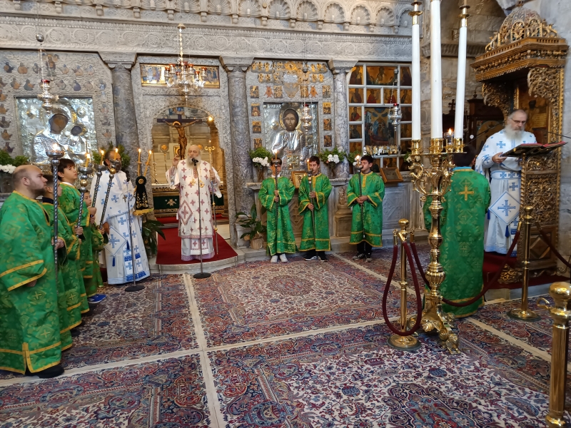 Τον Σεβασμιώτατο Ποιμενάρχη πλαισίωσαν οι πατέρες του Ιερού Προσκυνήματος Πρωτοπρ. π. Στυλιανός Μπιζάς και π. Χρήστος Πετρόπουλος.