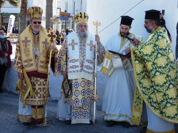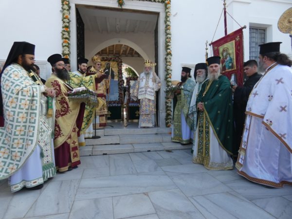 Κατά την διάρκεια του Κοινωνικού, ο Σεβασμιώτατος κήρυξε τον θείο λόγο, αναφερθείς στους δύο τιμωμένους Αγίους της πίστης, Θεοκτίστη και Νεκτάριο, Επίσκοπο Πενταπόλεως. Εν συνεχεία πραγματοποιήθηκε η Ιερά Λιτάνευση των Ιερών Εικόνων και των Τιμίων Λειψάνων των Αγίων, με κατεύθυνση τον κεντρικό λιμένα του νησιού, όπου εψάλη Δέηση για τους ναυτιλλομένους αδελφούς μας και εν συνεχεία η πομπή κατευθύνθηκε προς τα γραφικά σοκάκια της Παροικίας και ακολούθως προς το Ιερό Προσκύνημα.