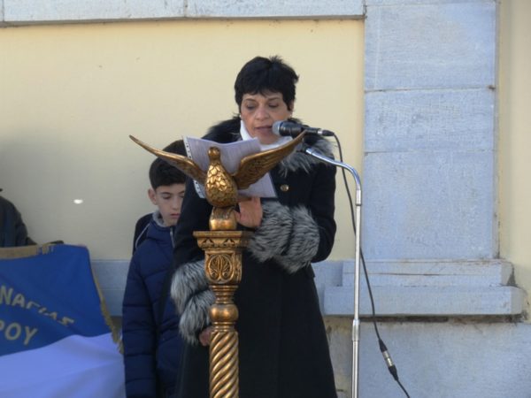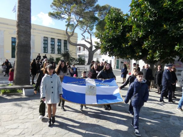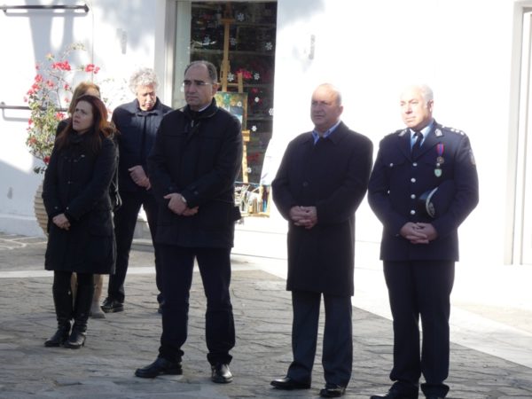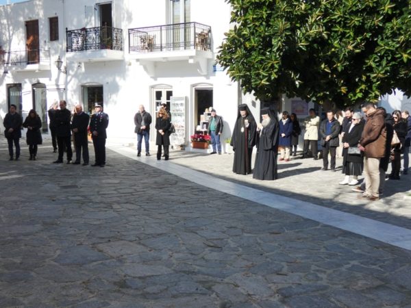 Ακολούθως ο Σεβασμιώτατος μετέβη στο Α΄ Δημοτικό Σχολείο Παροικίας (παραπλεύρως του Ιερού Προσκυνήματος της Εκατονταπυλιανής) όπου μπροστά από την είσοδο του σχολείου, τέλεσε μαζί με τον Θεοφιλέστατο Επίσκοπο Κεράμων κ. Βαρθολομαίο, Επιμνημόσυνη Δέηση υπέρ Αναπαύσεως των ψυχών της Δασκάλας Ειρήνης Κονδύλη και των δύο μαθητών Αθανασίου Φωκιανού και Φραγκίσκας Τσαντάνη, οι οποίοι πριν 80 χρόνια έχασαν την ζωή τους, όταν συμμαχικά αεροπλάνα βομβάρδισαν το κελί του Ιερού Προσκυνήματος της Παναγίας μας της Εκατονταπυλιανής, το οποίο φιλοξενούσε μία τάξη του Δημοτικού Σχολείου Παροικίας. Μετά το Τρισάγιο πραγματοποιήθηκε ομιλία από την Φιλόλογο και Πρόεδρο του Δημοτικού Συμβουλίου του Δήμου Πάρου κ. Ιφιγένεια Χατζηγεωργίου.