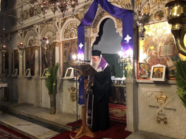 Κατά την διάρκεια του «Κοινωνικού» ανεγνώσθη η Εγκύκλιος της Ιεράς Συνόδου της Εκκλησίας της Ελλάδος με θέμα: «Συνοδικός Παραμυθητικός Λόγος γιά τήν Μεγάλη Ἑβδομάδα καί το Ἅγιον Πάσχα», την οποία απηύθυνε προς το Ευσεβές Ορθόδοξο Πλήρωμά της. Ακολούθως ευλόγησε τα Βάγια και τους κλάδους ελαίας με την ειδική ευχή του ευχολογίου.