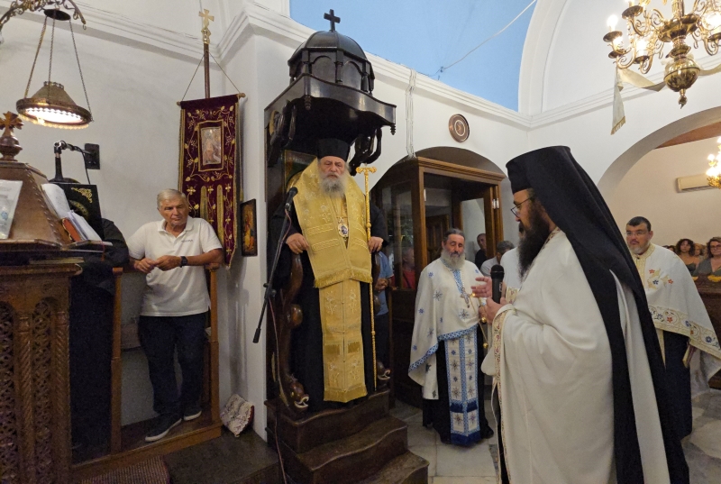 Κατόπιν, μετέβη στον Πανηγυρίζοντα Ιερό Ενοριακό Ναό Τιμίου Προδρόμου του ομωνύμου χωριού, όπου χοροστάτησε στον Πανηγυρικό Εσπερινό, ευλόγησε τους προσφερθέντες άρτους και κήρυξε τον θείο λόγο, με τη συμμετοχή κληρικών της νήσου.
