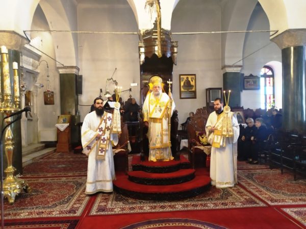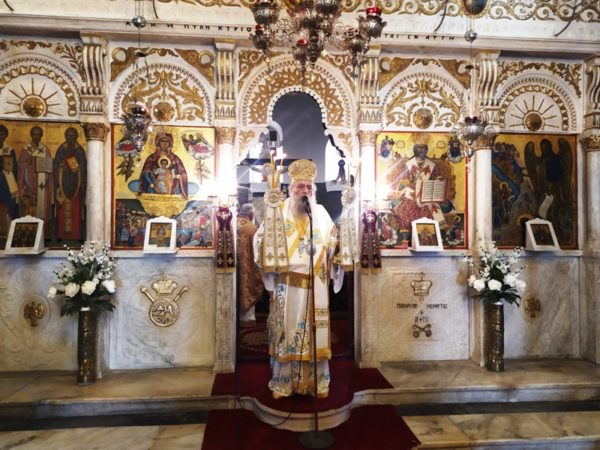 Ο Σεβασμιώτατος χοροστάτησε στον Όρθρο και προεξήρχε της Θείας Λειτουργίας, πλασιούμενος από τον οικείο Εφημέριο, Πρωτοπρ. π. Απόστολο Βελώνη και τους Διακόνους π. Νεκτάριο Σκουλάτο και π. Παναγίωτη Σιαχάμη.