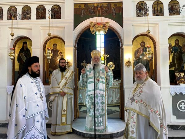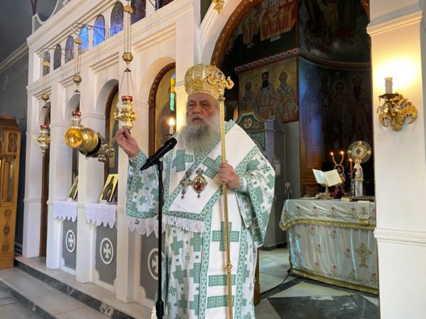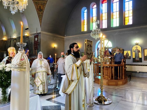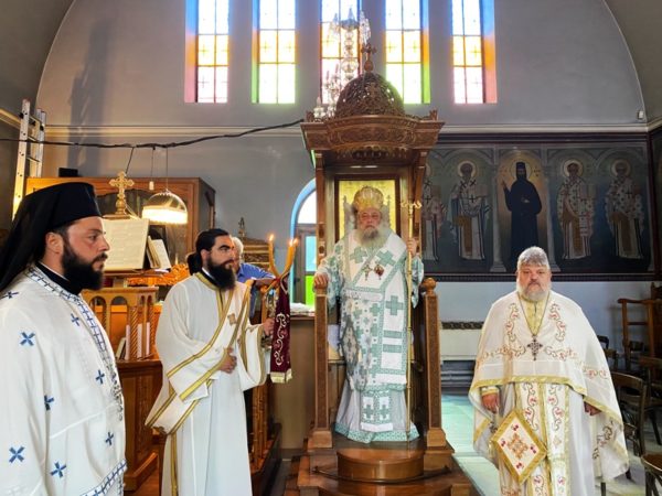 Ο Σεβασμιώτατος χοροστάτησε στον Όρθρο και ιερούργησε, πλαισιούμενος από τον Πρωτοσυγκελλεύοντα της Ιεράς Μητροπόλεως, Αρχιμ. Δωρόθεο Βενετσανόπουλο, τον Εφημέριο του Ιερού Ναού, Σταυροφ.-Οικον. Νικόλαο Βασιλάκη και τον Διάκονο Νεκτάριο Σκουλάτο.