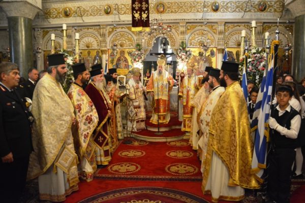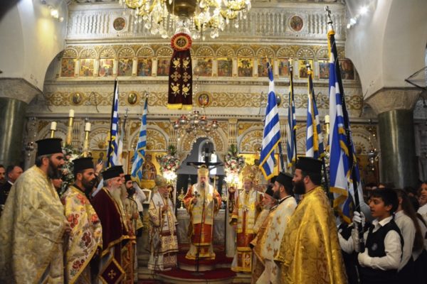 Επανελθούσης της Ιεράς Λιτανεύσεως και αφού εψάλη η ακροτελεύτιος Δέηση, ο Σεβασμιώτατος εξέφρασε τις ευχαριστίες του προς τους Αγίους Αρχιερείς για την συμμετοχή τους στην Ιερά Πανήγυρη του Μητροπολιτικού Ναού, τον Πρωθυπουργό και τους λοιπούς επισήμους, τους κληρικούς και λαϊκούς συνεργάτες του Ιερού Ναού για την προετοιμασία της Πανηγύρεως, τους χορούς των Ιεροψαλτών που τόσο την παραμονή όσο και ανήμερα απέδωσαν μελωδικότατα τους Ιερούς Ύμνους, τους μαθητές και τους εκπαιδευτικούς των σχολείων, άπαντες τους εκπροσώπους των πολιτικών, στρατιωτικών, δικαστικών και λοιπών αρχών και συλλόγων του νησιού καθώς και την Φιλαρμονική του Δήμου για την άρτια απόδοση των μελωδιών. Προς όλους δε τους συμμετέχοντες ο Σεβασμιώτατος ευχήθηκε πλουσία την Χάρη και ευλογία της Παναγίας μας στη ζωή και τα έργα τους και στις οικογένειές τους.