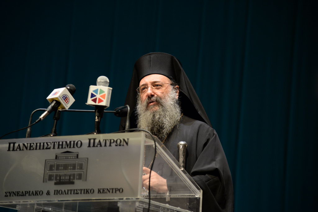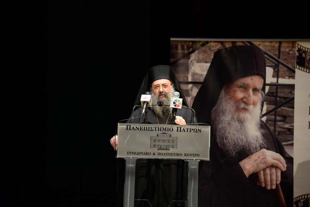Ὁ Σεβασμιώτατος Μητροπολίτης Πατρῶν κ.κ. Χρυσόστομος στὸ σύντομο χαιρετισμὸ πού ἀπηύθυνε μίλησε γιά τόν Ὀρθόδοξο καί δή γιά ἁγιορείτικο Μοναχισμό τόν ὁποῖον ὑπηρέτησε μετά ζεούσης καρδίας ὁ ἀοίδιμος Γέροντας Ἰωσήφ ὁ Βατοπαιδινός, τόν ὁποῖον ἐμακάρισε γιὰ τὴν ἀσκητική βιοτὴ καὶ πολιτεία του. Ὁ Σεβασμιώτατος εὐχαρίστησε τὸν Καθηγούμενο τῆς Ἱερᾶς Μονῆς Βατοπαιδίου Γέροντα Ἐφραίμ, (ὁ ὁποῖος τελικὰ δὲν παρέστη στὴν ἐκδήλωση, λόγῳ τοῦ αὐτοκινητιστικοῦ ἀτυχήματος πού εἶχε μετὰ τῆς συνοδείας του καὶ εὐχήθηκε σύντομα περαστικὰ καὶ γρήγορη ἀνάρρωση), τόσο γιὰ τὴν μεγάλη πνευματικὴ καὶ φιλανθρωπικὴ προσφορὰ τῆς Ἱερᾶς Μονῆς, ὃσο καὶ γιὰ τὴν συγγραφὴ τοῦ τόμου «Γέρων Ἰωσὴφ Βατοπαιδινός».