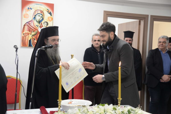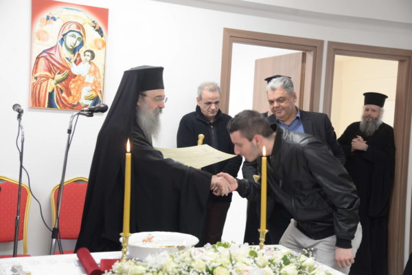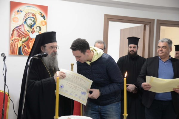Τέλος, ο Σεβασμιώτατος έδωσε τα πτυχία στους πτυχιούχους μαθητές της Σχολής Βυζαντινής Μουσικής της Ιεράς Μητροπόλεως Πατρών.