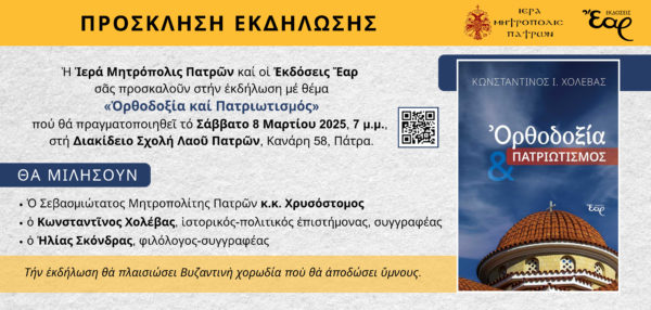 Η Ιερά Μητρόπολη Πατρών και οι Εκδόσεις Έαρ διοργανώνουν εκδήλωση με θέμα «Ορθοδοξία και Πατριωτισμός» που θα πραγματοποιηθεί το Σάββατο 8 Μαρτίου 2025, 7μ.μ., στη Διακίδειο Σχολή Λαού Πατρών, Κανάρη 58, Πάτρα.