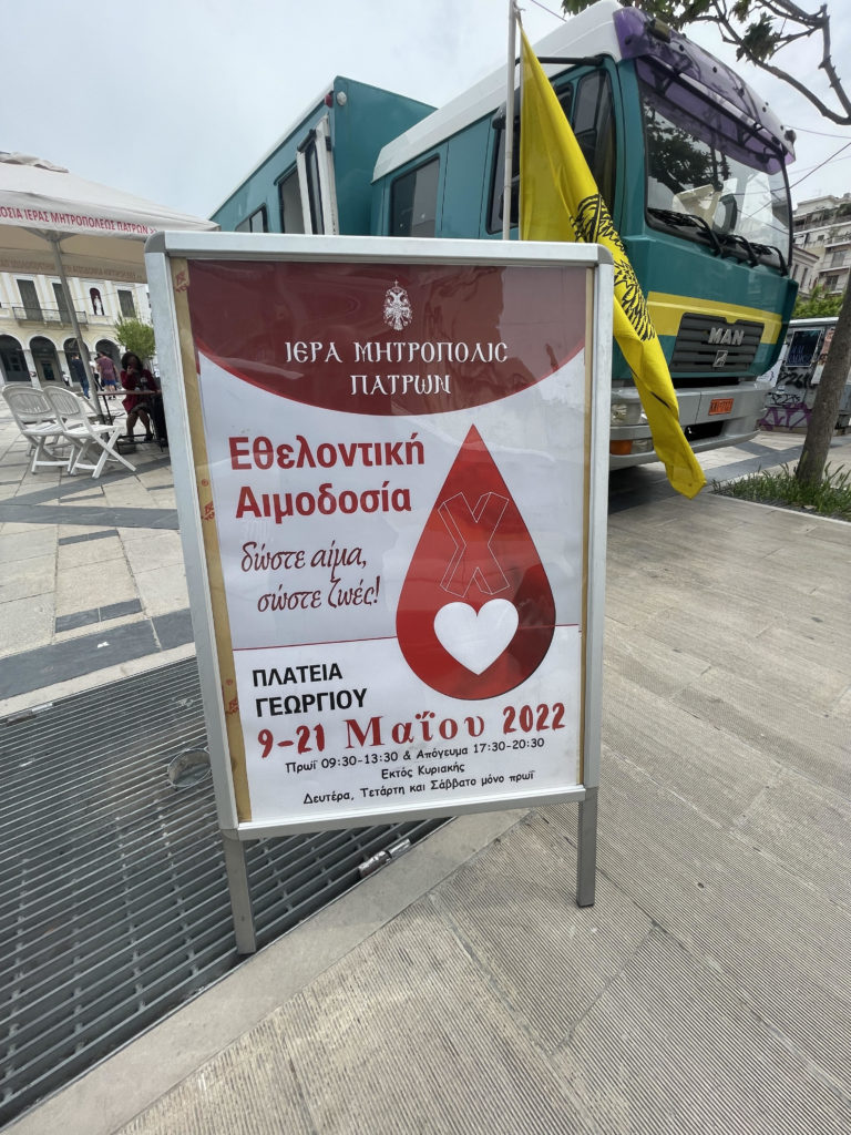 Με επιτυχία πραγματοποιήθηκε η αιμοδοσία της Ιεράς Μητρόπολης Πατρών, στην Πλατεία Γεωργίου από 9 έως 21 Μαΐου 2022, ύστερα από έκκληση του Σεβασμιώτατου Μητροπολίτη Πατρών κ. Χρυσοσοτόμου, για προσφορά λίγης ποσότητος αίματος, ώστε να καλυφθούν οι ανάγκες των Νοσοκομείων της πόλης, αλλά και γενικότερα, για την εξυπηρέτηση  των αναγκών ασθενών και άλλων περιοχών.