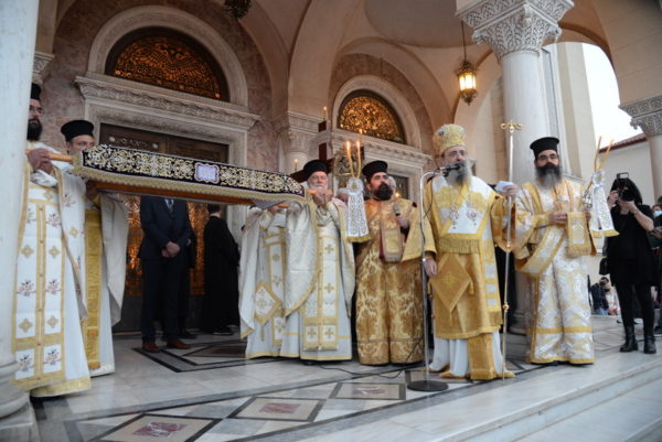 Το προσκύνημα ήτο συνεχές, ενώ με τις τηρούμενες αποστάσεις, οι πιστοί είχαν γεμίσει τον μεγάλο αύλειο χώρο του Ναού και πέραν αυτού.