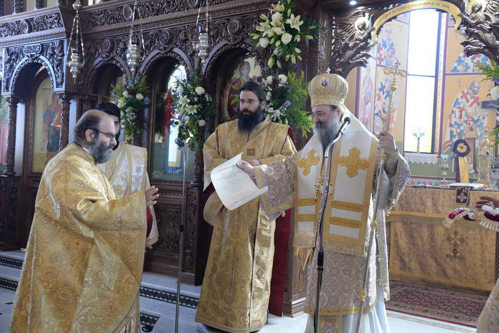 α) στόν Αἰδεσιμολογιώτατο Πρωτ. π. Σωτήριο Γαλάνη, ὁ ὁποῖος ὑπῆρξε πρῶτος Πρόεδρος τῆς Ἐρανικῆς Ἐπιτροπῆς γιά τήν ἀνέγερση τοῦ Ἱεροῦ Ναοῦ, ἐπαινέσας αὐτόν γιά τήν καλλίκαρπη διακονία του στόν ἀμπελῶνα τοῦ Κυρίου καί ἰδιαιτέρως στόν Ἱερό Ναό τῆς Ἁγίας Μαρίνης καί