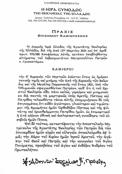 Παρακάτω η εγκύκλιος της Ιεράς Συνόδου της Εκκλησίας της Ελλάδος
