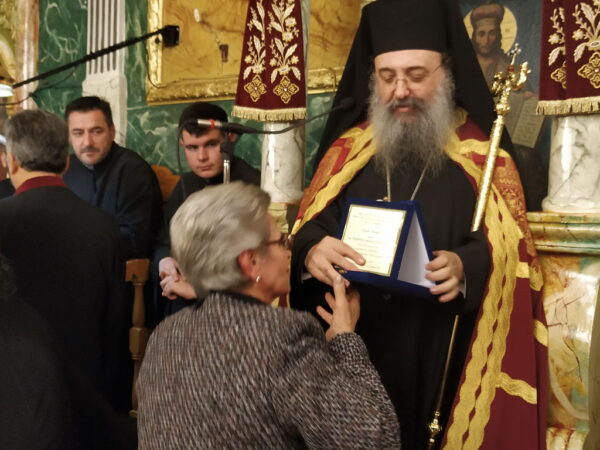 Προ της Απολύσεως ο Σεβασμιώτατος επέδωσε εκ μέρους του Εκκλησιαστικού Συμβουλίου του Ιερού Ναού τιμητική πλακέτα στην κ. Γεωργία Παπαδοπούλου για τις επί εικοσαετίαν υπηρεσίες της στην Ενορία του Αγίου Χαραλάμπους και επήνεσε αυτήν, ευχηθείς κάθε ευλογία παρά Κυρίου.