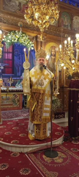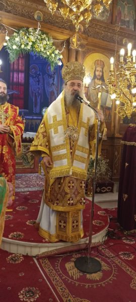 Στο κήρυγμά του ο Σεβασμιώτατος τόσο στον Εσπερινό, όσο και ανήμερα της μεγάλης εορτής, μίλησε για την σχέση και την σωτήρια κοινωνία που πρέπει να έχουμε με τον Ενανθρωπήσαντα Κύριό μας και για την πολυώνυμη και φρικτή αμαρτία η οποία οδηγεί στον θάνατο, κατά τον ουρανοβάμονα Απόστολο Παύλο.