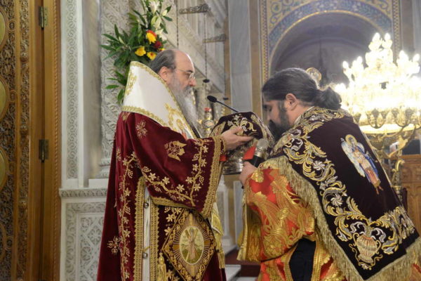 Ἐπίσης εὐχήθηκε τά δέοντα στόν Μακαριώτατο Ἀρχιεπίσκοπο Ἀθηνῶν καί Πάσης Ἑλλάδος κ.κ. Ἱερώνυμο καί τίς θερμές πρός τό σεπτό Σῶμα τῆς Ἱεραρχίας τῆς Ἑλλάδος, μνησθεῖς ὃτι κατ’ ἒτος πολλοί Ἀρχιερεῖς συμμετεῖχαν στήν Ἱερά Πανήγυρη τοῦ Ἁγίου μας.
