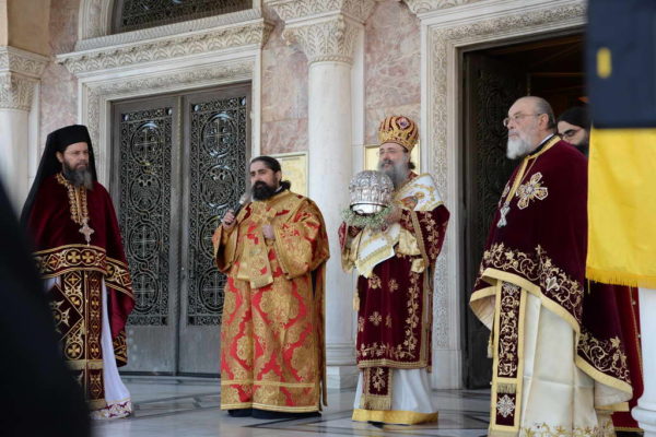 Ἡ ἁγία Κάρα τοῦ Πρωτοκλήτου ἐλιτανεύθη ἐντός τοῦ Ναοῦ καί στά πρόπυλα ὁ Σεβασμιώτατος ἀνέπεμψε δέηση ὑπέρ ὑγιείας καί σωτηρίας τοῦ σύμπαντος κόσμου.