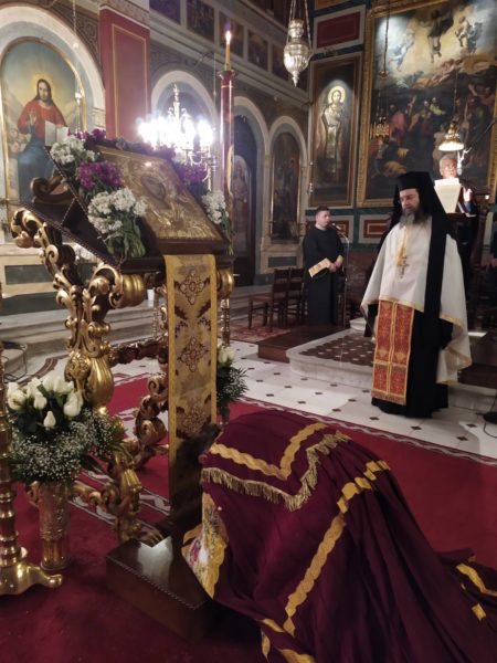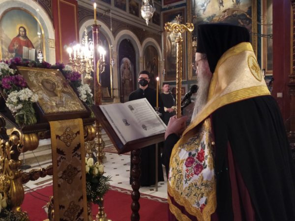 Μέσα σε κλίμα ιεράς κατανύξεως τελέσθηκε η Δ’ Στάσις των Χαιρετισμών, στον Ιερό Μητροπολιτικό Ναό Ευαγγελιστρίας Πατρών, χοροστατούντος του Σεβασμιωτάτου Μητροπολίτου Πατρών κ. Χρυσοστόμου, ο οποίος στο κήρυγμά του, ανέλυσε τους λόγους του Αγίου Συμεών του Νέου Θεολόγου περί της «συγγενείας των Αγίων, τρισσώς, με την Θεοτόκον Μαρίαν».