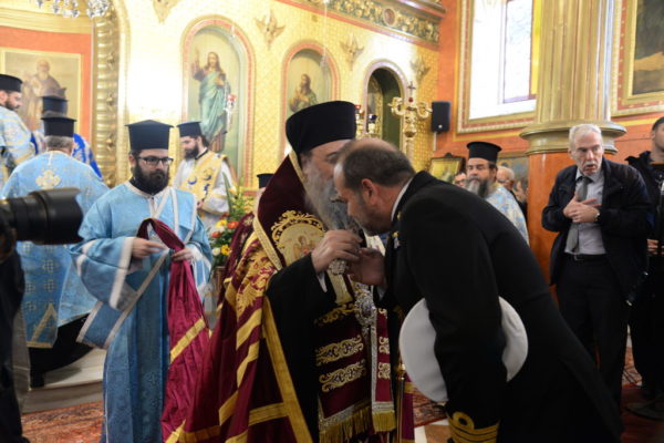 Μετά την Θεία Λειτουργία ετελέσθη η Δοξολογία, επί τη εορτή του Αγίου Νικολάου, προστάτου του Πολεμικού Ναυτικού και γενικώς των εν ταίς θαλάσσαις πλεόντων, χοροστατούντος του  Μητροπολίτου Πατρών κ. Χρυσοστόμου, ο οποίος ευχήθηκε τα δέοντα στους εορτάζοντας Ναυτικούς του Πολεμικού Ναυτικού, του Λιμενικού Σώματος και σε όλους τους εν θαλάσσαις πλέοντας.