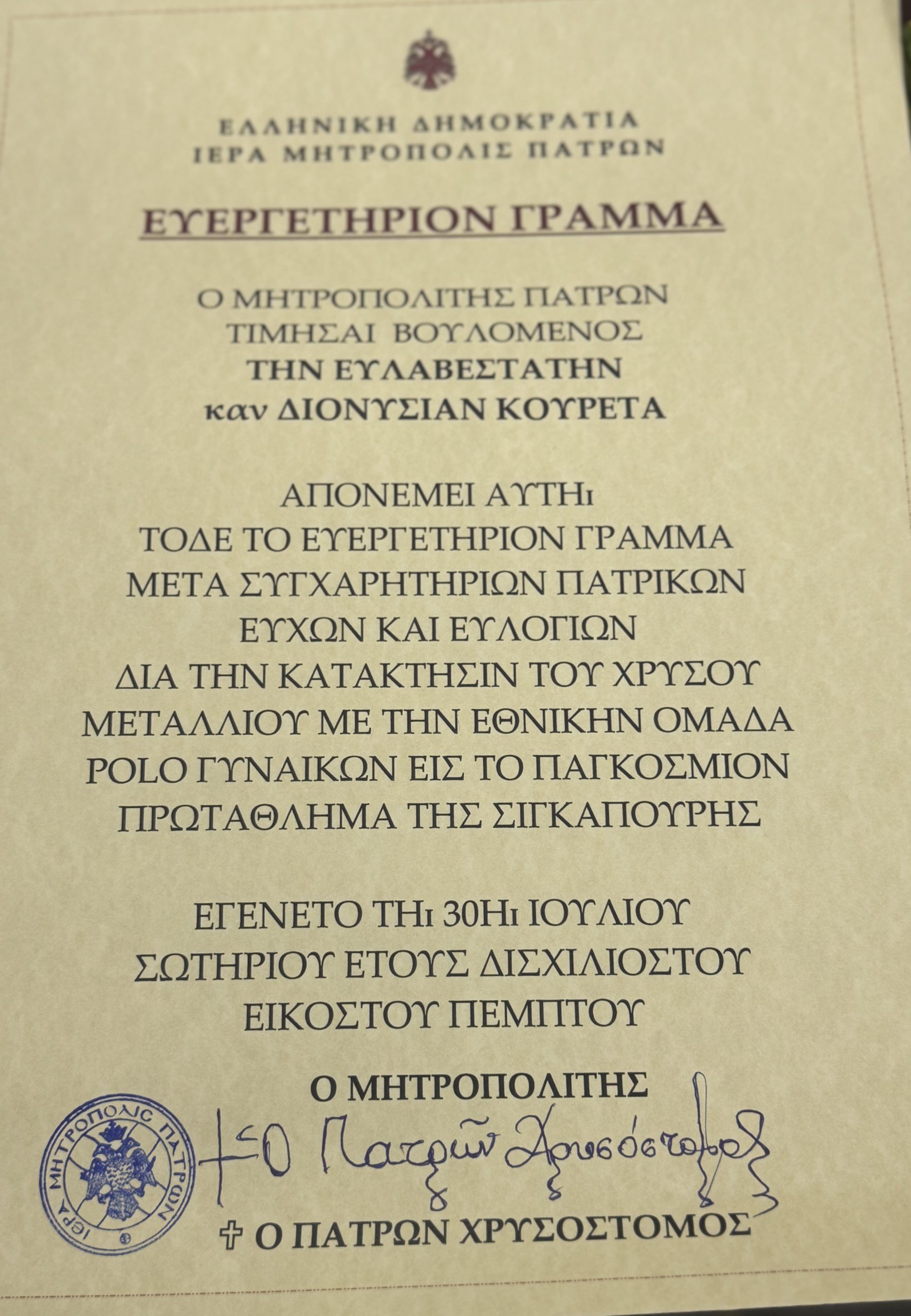 Με μεγάλη χαρά και πατρική αγάπη υποδέχθηκε στο Γραφείο του, ο Σεβασμιώτατος Μητροπολίτης Πατρών κ. Χρυσόστομος, την Πατρινοπούλα χρυσή Πρωταθλήτρια Πόλο, Διονυσία (Ντένια) Κουρέτα, η οποία μαζί με τις άλλες Πρωταθλήτριες Πόλο, κατήγαγαν στη Σιγκαπούρη χρυσή νίκη και χάρισαν στην Ελλάδα χρυσό μετάλλιο.