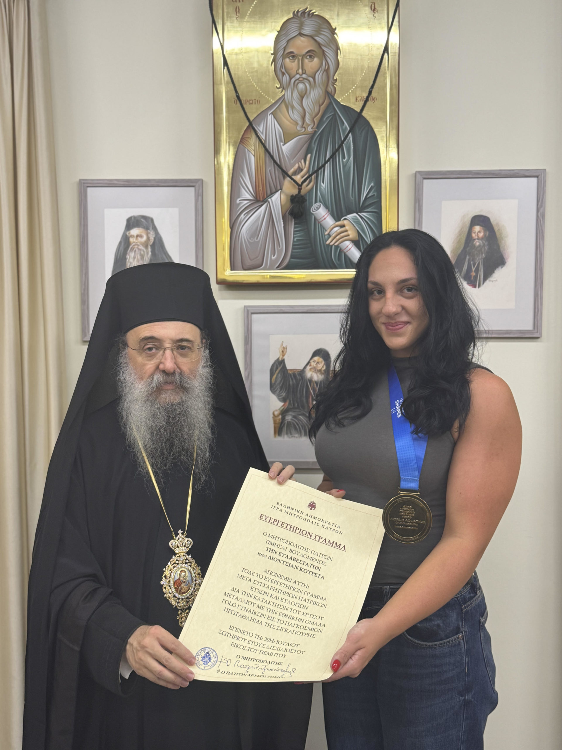 Ο Μητροπολίτης Πατρών τίμησε την Πατρινιά Χρυσή Πρωταθλήτρια Πόλο, Ντένια Κουρέτα