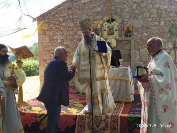 Μετά το πέρας της Θείας Λειτουργίας ο Σεβασμιώτατος προσέφερε τιμητική πλακέτα εκ μέρους του Εκκλησιαστικού Συμβουλίου στους κυρίους Παναγιώτη Σκούτα και Φώτιο Καρβελά για τις πολλές υπηρεσίες τους στο τόπο καταγωγής τους, στο Λεόντιο και γενικότερα στην κοινωνία.