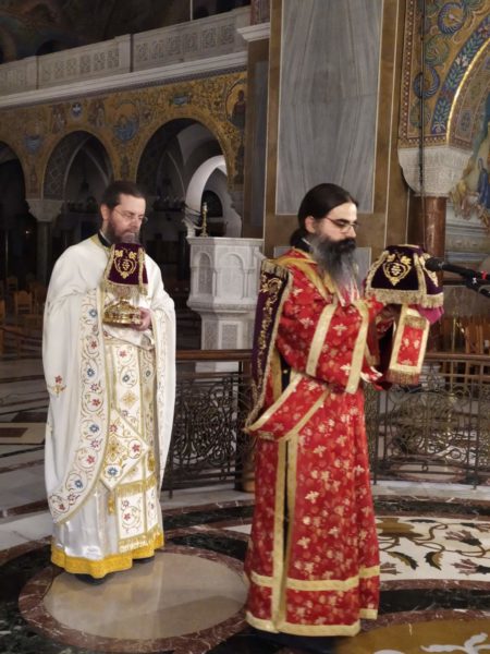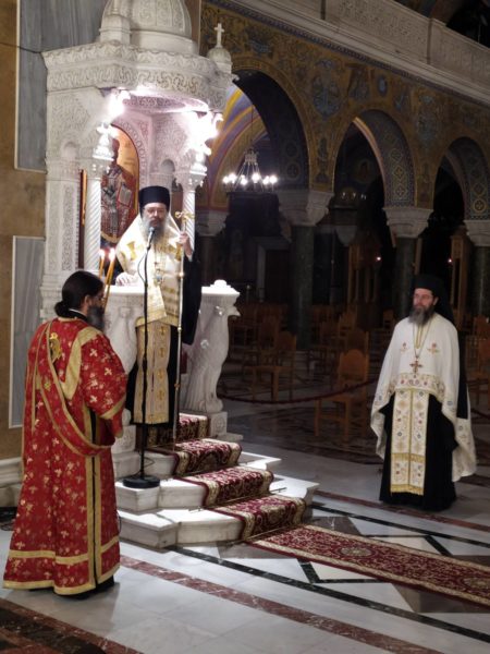 Ο Σεβασμιώτατος ανέπεμψε δέηση και παρεκάλεσε την Κυρία Θεοτόκο να μεσιτεύση προς τον Υιόν και Θεόν Της, τον Κύριον ημών Ιησούν Χριστόν, να απαλλάξη την Πατρίδα μας και τον κόσμο όλο, από την φοβεράν του λοιμού απειλή. Ειδικά ηυχήθη και παρεκάλεσε υπέρ υγιείας του Μακαριωτάτου Αρχιεπισκόπου Αθηνών και Πάσης Ελλάδος κ.κ. Ιερωνύμου. Επίσης προσευχήθηκε και δέηση ανέπεμψε υπέρ υγιείας του Μακαριωτάτου Αρχιεπισκόπου Τιράνων και Πάσης Αλβανίας κ. Αναστασίου, ο οποίος ανεγέννησε εκ της τέφρας ,ως είπε, την Εκκλησία της Αλβανίας, αλλά και υπέρ υγιείας όλων των αδελφών μας Κληρικών και Λαικών, οι οποίοι νοσηλεύονται στα Νοσοκομεία η νοσούν εξ’ αιτίας της πανδημίας του κορωνοιού.