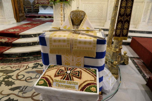 Στο τέλος της Θείας Λειτουργίας, ετελέσθη ιερό Μνημόσυνο, υπέρ μακαρίας μνήμης και αιωνίου αναπαύσεως του αοιδίμου Εθνεγέρτου Ιεράρχου, Παλαιών Πατρών Γερμανού.